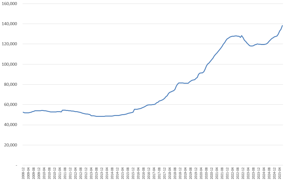 다만, 거의 일정하게 10년에 2배 정도 증가하는 수치를 볼 수 있다.